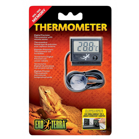 The Exo Terra Digital Thermometer is equipped with a remote sensor for accurate measurement and durability. These precision instruments come with a programmable minimum and maximum memory setting which can be controlled with one single button. The remote sensor can be held in place with the suction cup provided and the instrument includes a hook and loop fastener for easy mounting.