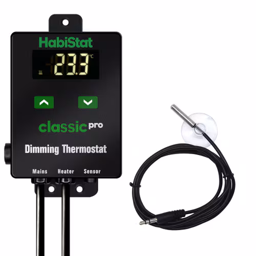 The HabiStat Classic Pro Dimming Thermostat is the go-to choice for keepers using heat lamps to warm their enclosures. Designed to deliver smooth and accurate temperature control, this thermostat works by supplying a variable, continuous flow of power, rather than switching the power on and off. This makes it ideal for use with all light emitting heat sources as well as Arcadia Deep Heat Projector.