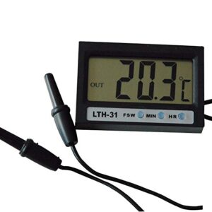 This electronic thermometer has two external sensors which allows measuring the temperature in two different spots. The dual sensors are ideal for use in vivariums, tortoise tables and hibernation boxes. The sensors can also be used for measurements in water. The device has a large display for easy readouts and a clock function.
