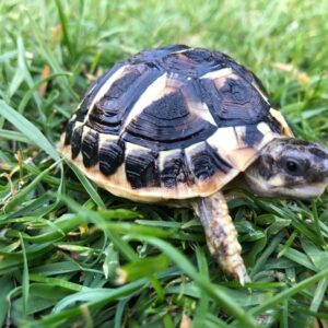 The Western ‘Dwarf’ Hermanns tortoise originates from Western Europe. This is a hibernating breed. It is a slightly more rare kept species of tortoise within the UK due to other species being more readily available. Western Dwarf Hermann’s are within the small sized family of tortoise breeds and can live up to 50 years or more. High UV lighting is required and low humidity. On average, an adult Western Dwarf Hermann’s tortoise will grow to approximately 4-5 inches (10-13cms). However, this may vary in individuals.